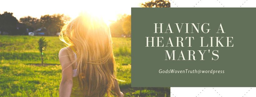 Hi Girls, So glad to have you come across my blog here at God's Woven Truth. I am so EXCITED to talk about Mary and her heart for Jesus. Just recently I have been reading the book, Having A Mary Heart In a Martha World, By Joanna Weaver. Not only has Mary come up in … Continue reading Having A Heart Like Mary’s